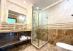 The elegant bathroom is beautifully tiled and has a walk-in shower.