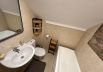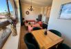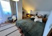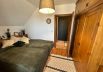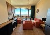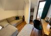 The spacious accommodation includes a fully equipped open-plan kitchen and a comfortable living room with a cozy dining area, suitable for four guests. There is a modern bathroom with a bathtub, as well as a convenient additional toilet. The master bedroom is furnished with two single beds, a dressing table, a wardrobe and a fan for cooling down during the warmer months. It also provides direct access to a balcony with garden furniture, ideal for enjoying the stunning mountain views. The second bedroom has been carefully designed as an office space, allowing you to work comfortably while enjoying your stay in Bansko. The room can easily be converted into a guest or children's bedroom, featuring a sofa bed, a mirror so you can get ready in the morning in your own space, and its own access to the balcony. The living room, decorated in warm colors, has a wooden coffee table and an arched window with panoramic views of Bansko.