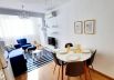 The apartment has a living room with a sofa bed, a dining area, air conditioning, a TV and an equipped kitchenette, one bedroom, a spacious terrace with a sofa and a table, a bathroom.