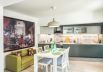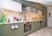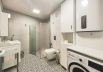 - a dining room with a fully equipped kitchen, table and chairs; a large bathroom with an elegant interior, shower, toilet and washing machine;