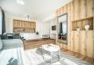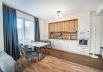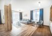 - living area with a comfortable sofa bed, coffee table, dining area with dining table and chairs and a fully equipped kitchen (including washing machine, coffee machine and dishwasher);