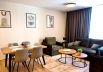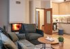 Antonovi Apartments Deluxe apartment has a cozy living room with a fireplace, TV, dining area, fully equipped kitchenette, one bedroom and a bathroom.