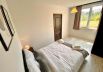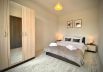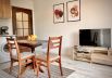 The apartment has a bedroom with a large double bed, a living room with a sofa bed and a fully equipped kitchen with a dining area.