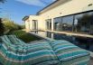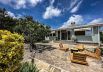 Oasis Beach House has a large and well-kept garden, surrounded by flowers and pine trees. In the garden there are two seating areas, a dining table and chairs, as well as a modern fireplace with wooden armchairs around it.
