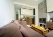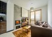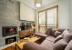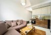 The apartment has a living room with a comfortable sofa, TV, fireplace, equipped kitchenette, bedroom and bathroom.